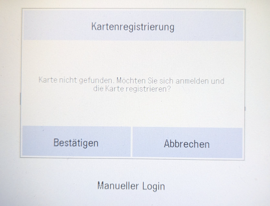 Wenn dieser Dialog erscheint, dann muss der Transponder / die Karte noch registriert werden.